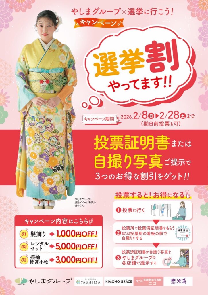 やしまグループでは若い方にももっと選挙に関心をもっていただくために『選挙割』と題し、選挙で投票した方にはお得なサービスを提供しております。 選挙割期間:2月8日(日)~28日(土)対象店舗:やしまグループ全店 これから成人式を迎える方が、少しでも自らの将来を考えて投票することを応援しています!